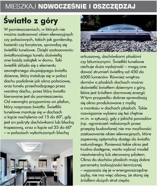 Funkcjonalność nowoczesnych okien. Zarówno te pionowe, jak i połaciowe doświetlają wnętrza, wprowadzając cenne światło dzienne, stanowią jednocześnie skuteczną barierę dla chłodu czy uciążliwych dźwięków dochodzących z zewnątrz. Zapewniają także napływ świeżego powietrza do domów z wentylacją grawitacyjną. Ich obsługa staje się coraz bardziej komfortowa – wyposażając okna w siłowniki, można sterować pracą skrzydeł z dowolnego miejsca.