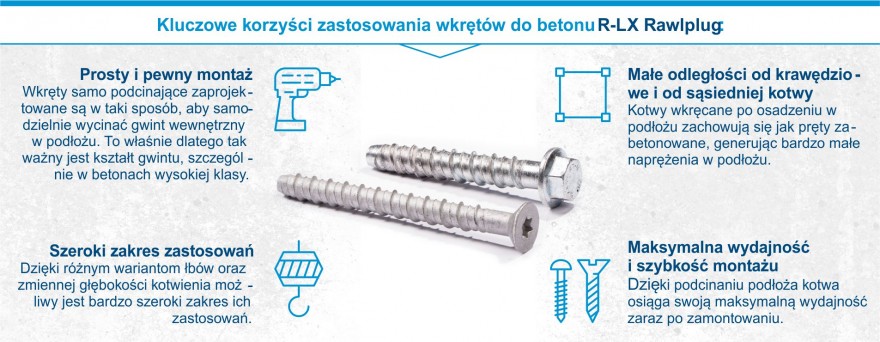 Wspominana kilka razy specyfika budowy i charakterystyki pracy wkrętów do betonu R-LX Rawlplug zapewnia nie tylko na osiąganie zwiększonej nośności, ale również umożliwia mniejsze wymagane odstępy osiowe oraz krawędziowe, przy zachowaniu wszystkich zalet klasycznych rozprężnych kotew opaskowych. Wszystko wskazuje na to, że to produkt pierwszego wyboru, szczególnie przy masowej potrzebie kotwienia, podczas montowania balustrad i poręczy, bram i ogrodzeń, regałów, krzesełek i ławek publicznych, instalacji czy konstrukcji stalowych, odbojników, konstrukcji attyk czy ryglówek.